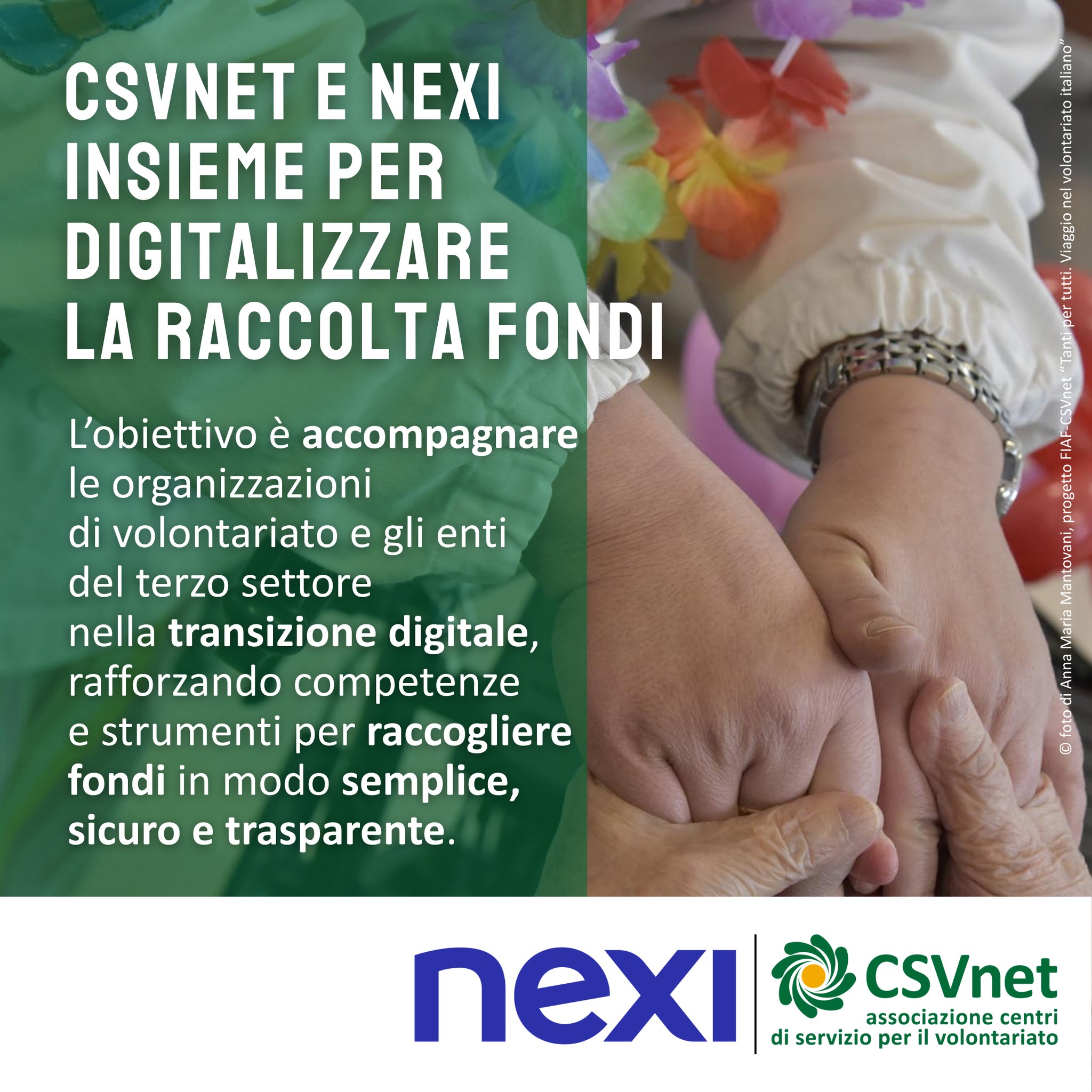 Accompagnare le organizzazioni di volontariato e gli enti del terzo settore (Ets) nella transizione digitale, rafforzando competenze e strumenti per raccogliere fondi in modo semplice, sicuro e trasparente. È questo l’obiettivo dell’accordo strategico siglato tra CSVnet, l’associazione nazionale dei 49 Centri di servizio per il volontariato (Csv), e Nexi, PayTech leader nei pagamenti digitali in Italia e in Europa.
