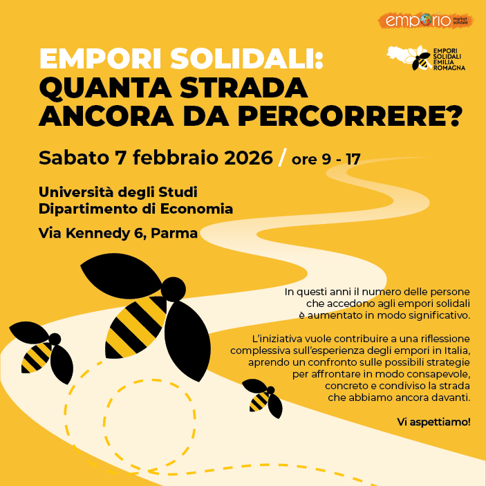 Una riflessione a 360° sull’esperienza degli empori solidali a livello nazionale: Empori Solidali Emilia Romagna Odv e Market Solidale di Parma sono i promotori del convegno “Empori solidali: quanta strada ancora da percorrere?” in programma il 7 febbraio 2026 presso l’Università di Parma, una riflessione a 360° sull’esperienza degli empori solidali a livello Nazionale. L’evento rientra nel progetto “Facciamo squadra contro la povertà” finanziato dalla Regione Emilia Romagna, parteciperà ai saluti introduttivi l’Assessora ad Agenda digitale, Legalità, Contrasto alle povertà Elena Mazzoni.